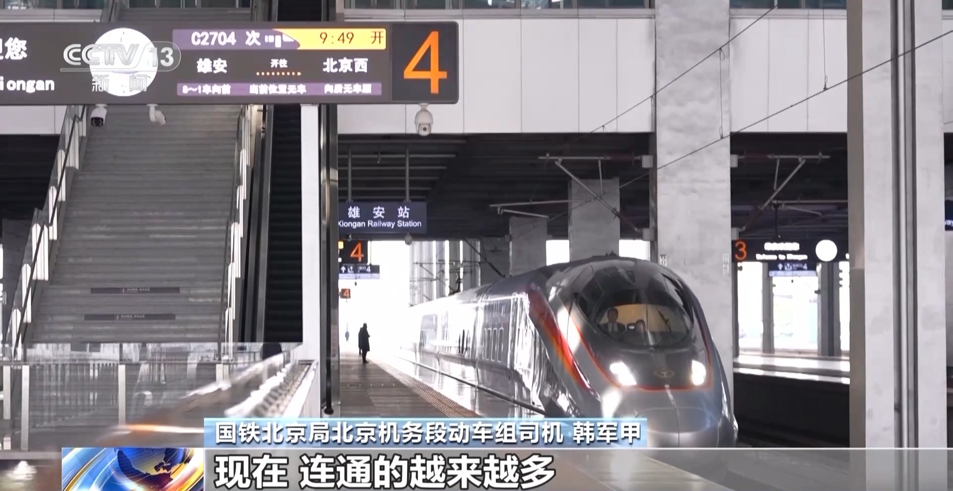 国铁北京局北京机务段动车组司机 韩军甲:刚开车到雄安的时候,这里只是一座车站。现在,连通的越来越多,像去年年底天津方向过来的津兴高铁,和现在正在建设当中的南向的雄商、西向的雄忻高铁,这里将是一座新的枢纽,想一想非常开心,我想多开几年高铁。