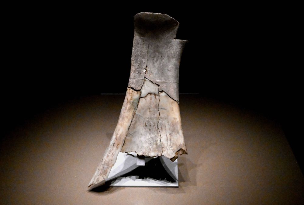2月26日,参观者在河南安阳殷墟博物馆新馆内观看展出的刻辞卜甲。
