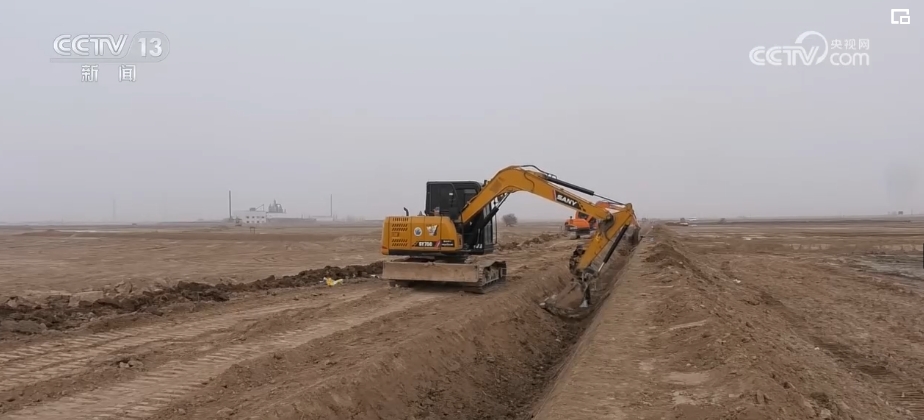 在巴彦淖尔市临河区32.69万亩高标准农田建设现场,大型机械正在开展挖沟渠、推平地垄、清运积土等作业。