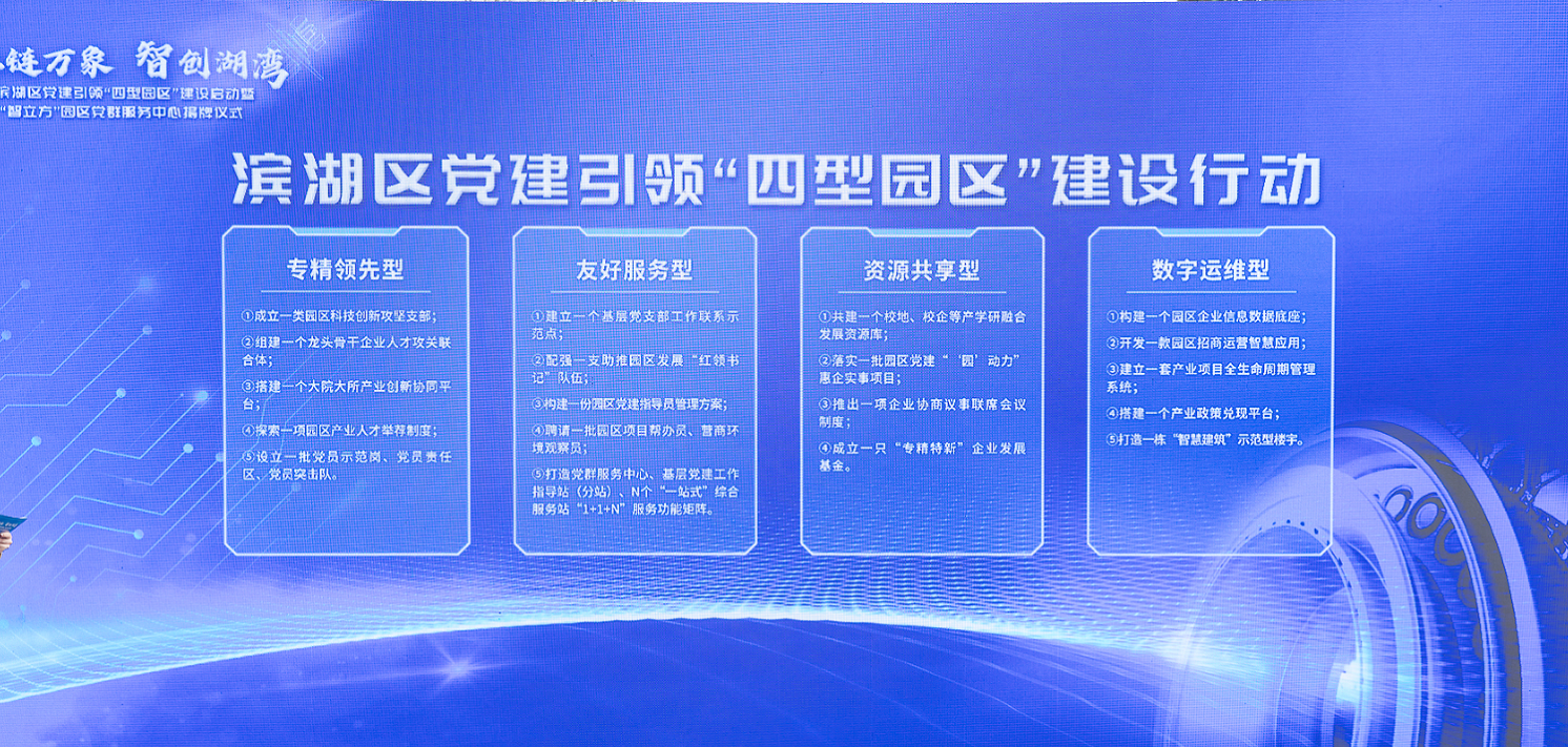 为推动打造优势更优、强项更强、特色更特的滨湖产业发展新生态,聚焦“十大特色产业园区”,此次活动特别推出党建引领“四型园区”建设行动,围绕打造专精领先型、友好服务型、资源共享型、数字运维型“四型园区”工作思路,升级焕新全区园区党群服务品牌,以高质量党建推动高质量发展。
