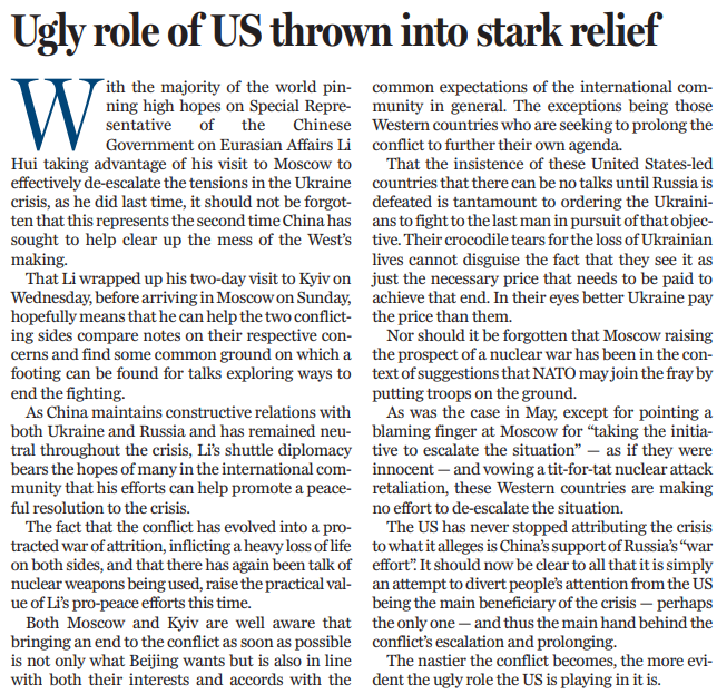 这场冲突越激烈,美国在其中扮演的丑恶角色也就越明显。而中方愿继续努力劝和促谈,在俄、乌及有关各方之间穿梭斡旋、凝聚共识,推动乌克兰危机最终政治解决。
