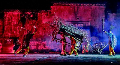 循着激越的鼓乐声,狮舞追着金光,在空中滚、转、腾、翻、旋、跃、颠、扑,变换舞姿,一会儿伏身跳跃,一会儿腾空翻转,一会儿遥望星月……喜、怒、哀、乐、动、静、惊、疑等神态展现得淋漓尽致。