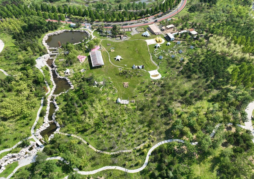 2023年7月25日拍摄的河北唐山花海景区(无人机照片)。该景区曾是采煤塌陷区,2018年以来,唐山市开平区持续对这一区域进行生态修复,并引入露营、餐饮、游乐园等旅游业态,将其打造成为“城市后花园”和生态城市建设的新名片,实现“矿区变景区”的“绿色转身”。