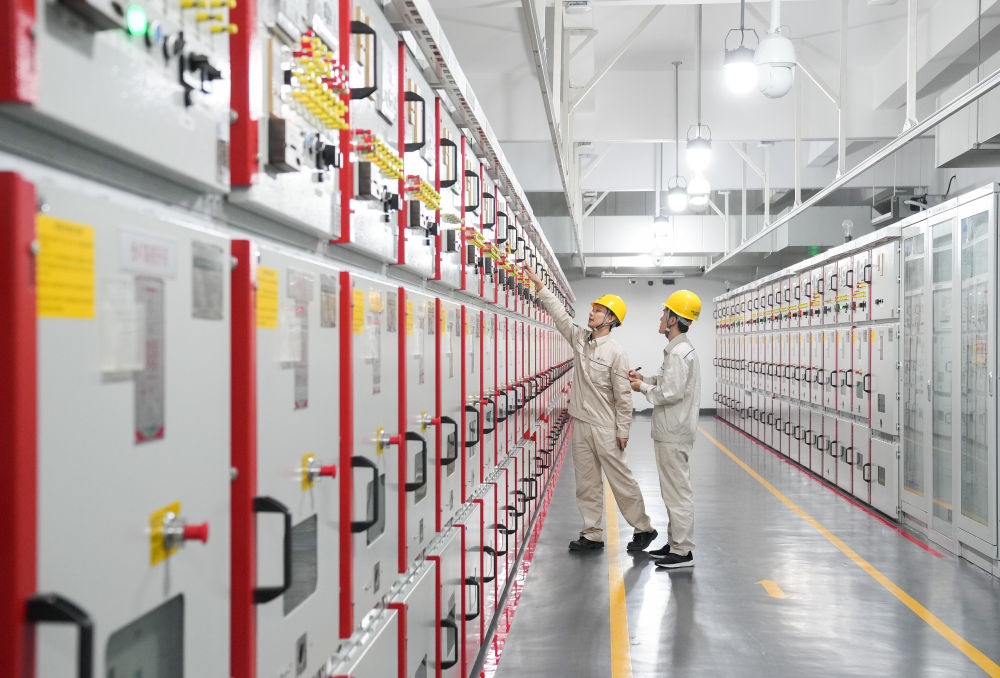 2023年11月4日,第六届中国国际进口博览会开幕前夕,国网上海青浦供电公司工作人员在变电站内巡视。此届进博会通过省间绿电交易的方式,成功采购绿电800万千瓦时,覆盖本届进博会展前、展中、展后期间的全部用电量,也标志着进博会首次实现全绿电办展。