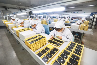 山东省荣成市港西镇一家外资电子制造企业的工人们在电子智能设备生产线上忙碌着,赶制出口国外的订单产品。
