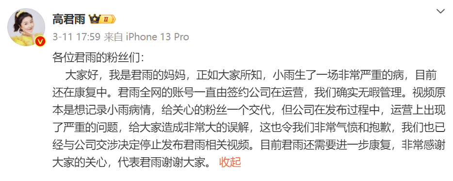 3月11日,高君雨的妈妈发文致歉称,女儿还在康复中,其全网账号一直由签约公司运营,公司在发布过程中出现了严重的问题。