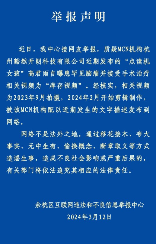 3月12日,官方发布举报声明证实,相关视频为2023年9月拍摄,2024年2月开始剪辑制作,由MCN机构配以近期发生的文字描述发布到网络。