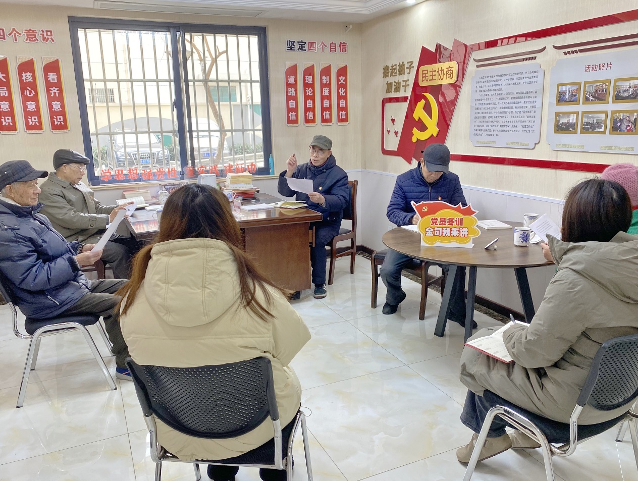 在蠡湖社区“红色阵地”先锋党员活动室里,党员冬训“金句我来讲”活动正如火如荼地开展。活动中,支部书记与年轻党员一起分享理论学习心得,畅谈民生实事。大家把近期学习的金句美文、感悟心得与社区重点工作、民生要事难事相结合一一做了分享。
