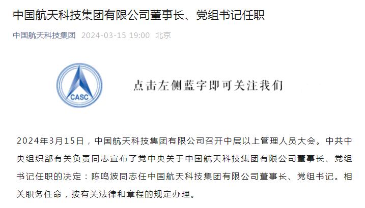 2024年3月15日,中国航天科技集团有限公司召开中层以上管理人员大会。中共中央组织部有关负责同志宣布了党中央关于中国航天科技集团有限公司董事长、党组书记任职的决定:陈鸣波同志任中国航天科技集团有限公司董事长、党组书记。相关职务任命,按有关法律和章程的规定办理。