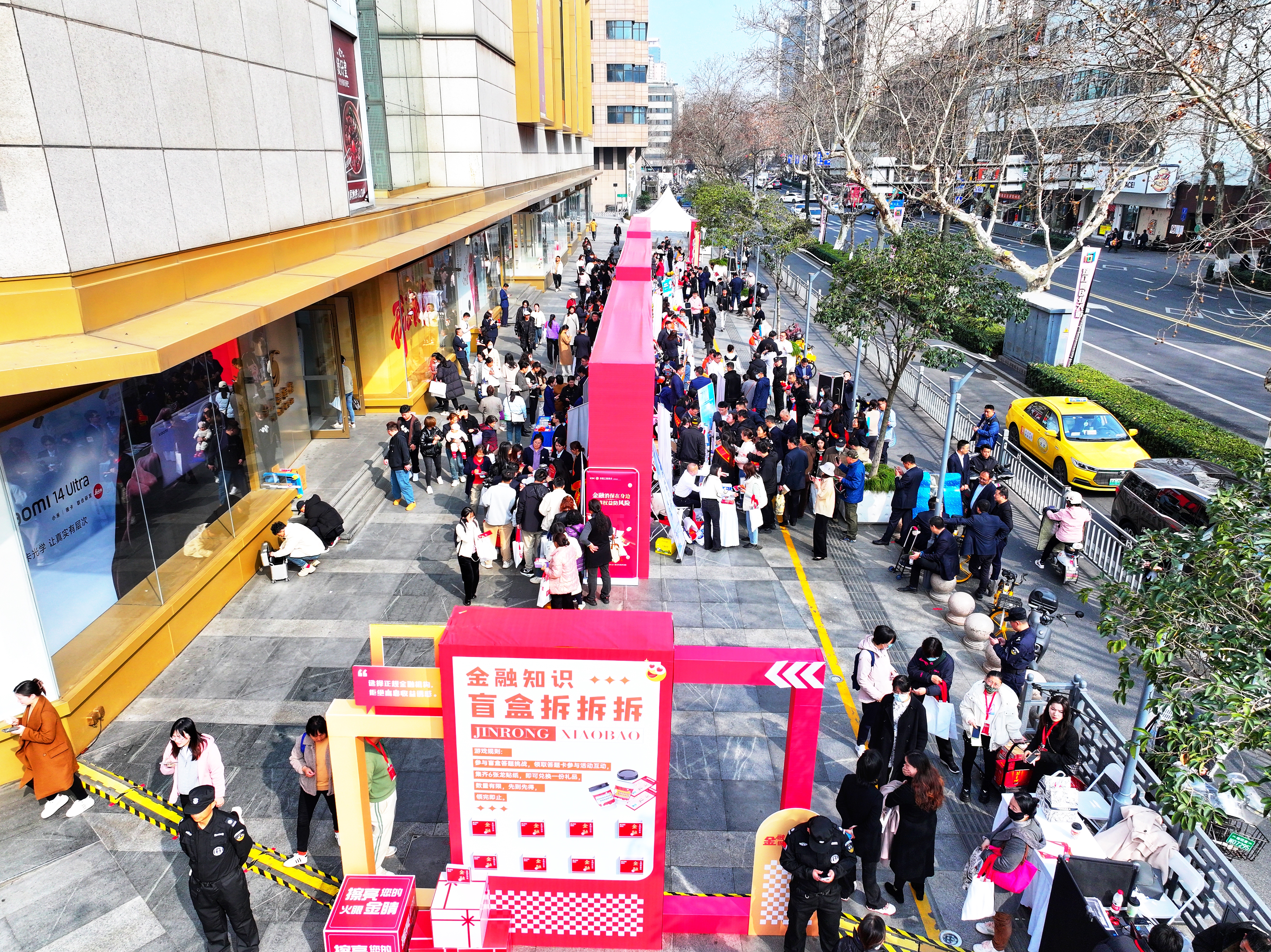 活动现场设置了标语、金融知识盲盒、金融市集等形式,向市民普及金融知识。在金鹰广场上,红白底色的金融宣教标语吸引眼球,“金融消保在身边 保障权益防风险”“理性投资 让梦想更自由”“理性投资 让梦想更自由”……沿着地面上的宣传标语走去,几位年轻人正在“金融知识盲盒拆拆拆”区域拍照打卡。“在这里随机抽取融宣教卡片,金融市集各家的展位上可以领取贴纸,集满6个贴纸即可领取饮品。”工作人员介绍。
