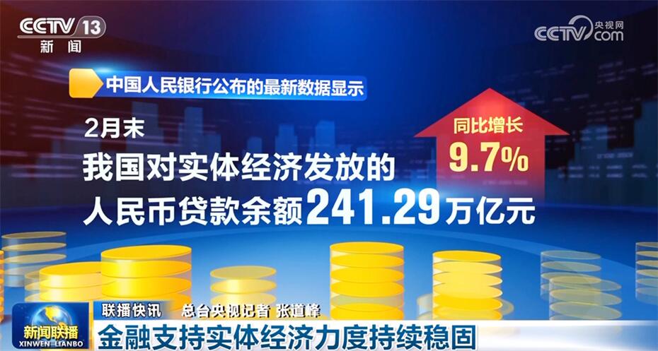 中国人民银行公布的最新数据显示,2月末,我国对实体经济发放的人民币贷款余额241.29万亿元,同比增长9.7%。高新技术、“专精特新”、科技中小企业贷款余额同比增长较快。2月份新发企业贷款加权平均利率为3.76%,比上年同期低11个基点,实体经济融资成本持续降低。