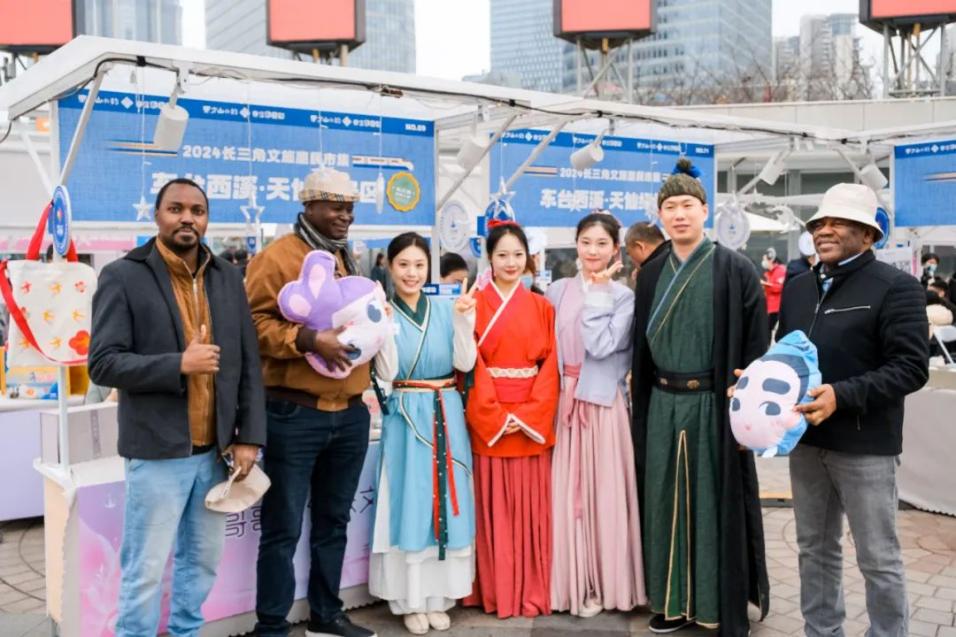 东台西溪的文创展位前,身着素雅服饰的推介人员,笑脸盈盈,热情欢迎每一位到来的友人。