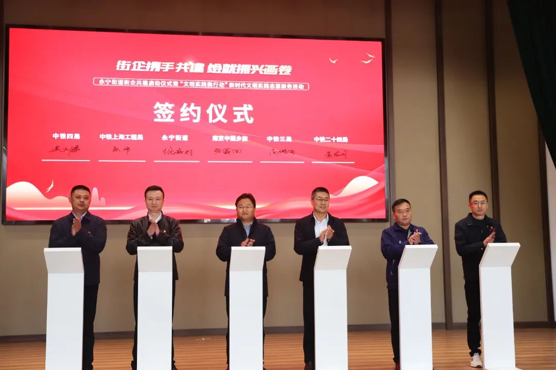 活动现场,永宁街道与中铁三局南京枢纽站前 4 标项目部、中铁二十四局南京北站项目部、中建八局城发公司城市投资公司南京项目公司、中铁上海工程局南京枢纽站前2标项目部、中铁四局集团第四工程有限公司浦口制梁场共同签署《永宁街道区域化党建共建协议书》,整合资源,同向发力,以区域一体化党建引领高质量发展。