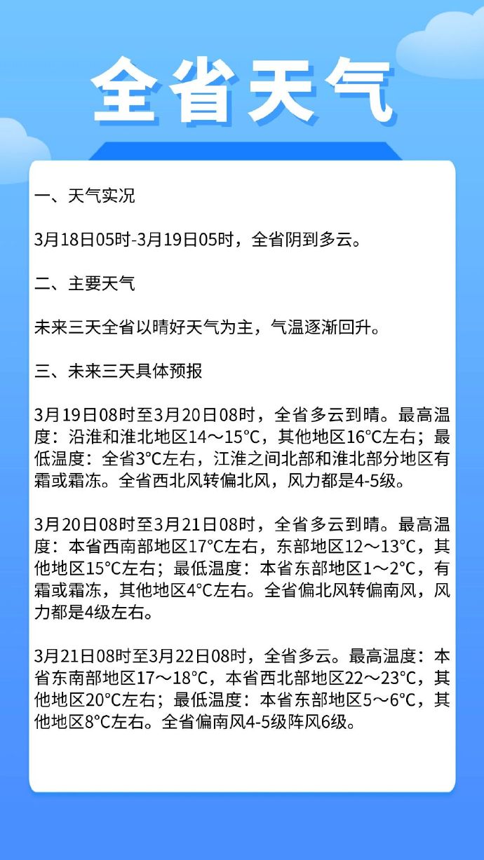 【未来三天全省以晴好天气为主,气温逐渐回升】3月19日08时至3月20日08时,全省多云到晴。最高温度:沿淮和淮北地区14~15℃,其他地区16℃左右;最低温度:全省3℃左右,江淮之间北部和淮北部分地区有霜或霜冻。全省西北风转偏北风,风力都是4-5级。(@江苏气象)
