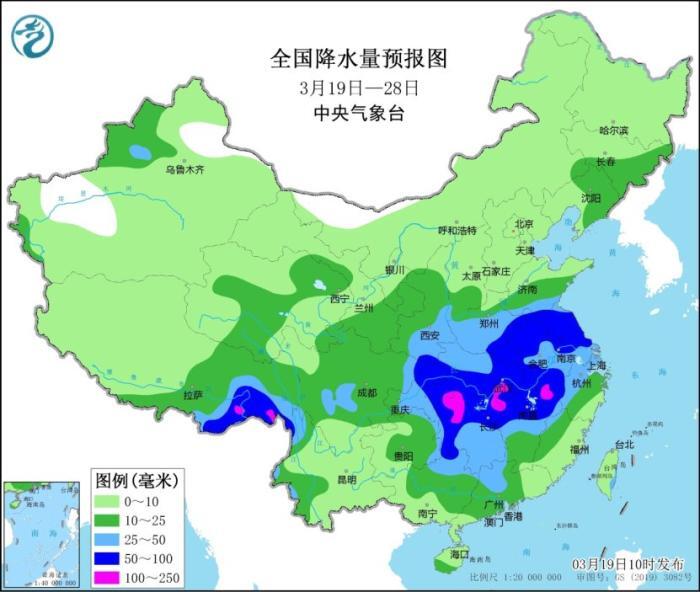 未来10天(3月19-28日),江淮、江汉大部、江南北部、重庆东北部、西藏东南部等地累计降水量有50~80毫米,其中江西北部、湖北东南部、湖南北部、西藏东南部等地部分地区有100~130毫米,局地超过150毫米;新疆北部和西部、西北地区中部和东部、华北西部、内蒙古中东部、东北地区中南部、黄淮等地部分地区有5~15毫米,陕西南部、河南中南部、山东南部等地部分地区有25~40毫米,局地超过50毫米。江南西北部、江汉、江淮、黄淮、西北地区中东部、重庆、贵州东部、云南西南部、青藏高原东部及新疆西北部等地大部地区较常年同期偏多4~7成,局地偏多1倍以上;江南南部、华南大部、云南东部等地降水偏少3~7成。