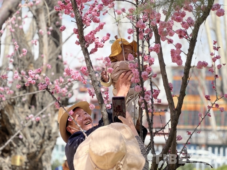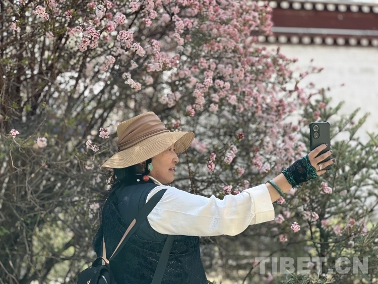 图为3月19日,拉萨市民在布达拉宫脚下的宗角禄康公园里赏花并拍照留念 摄影:德吉卓玛