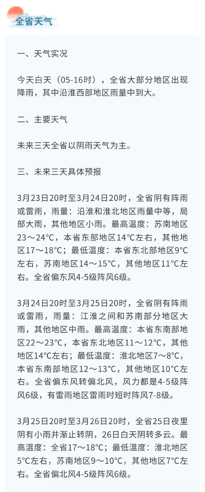 3月24日20时至3月25日20时,全省阴有阵雨或雷雨,雨量:江淮之间和苏南部分地区大雨,其他地区中雨。最高温度:本省东南部地区22~23℃,本省东北地区11~12℃,其他地区14℃左右;最低温度:淮北地区7~8℃,本省东南部地区12~13℃,其他地区10℃左右。全省偏东风转偏北风,风力都是4到5级阵风6级,有雷雨地区雷雨时短时阵风7到8级。