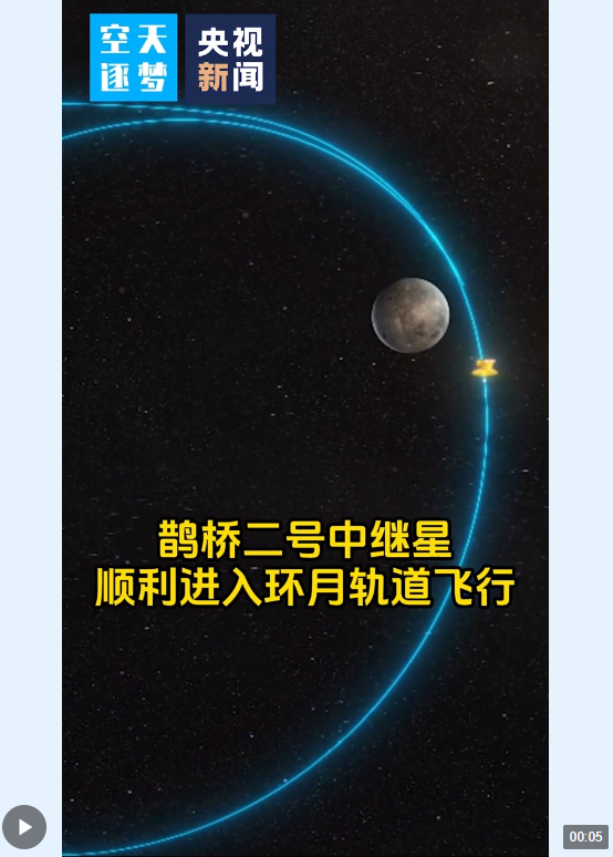记者从国家航天局获悉,3月25日0时46分,鹊桥二号中继星经过约112小时奔月飞行,在距月面约440公里处开始实施近月制动,约19分钟后,顺利进入环月轨道飞行。