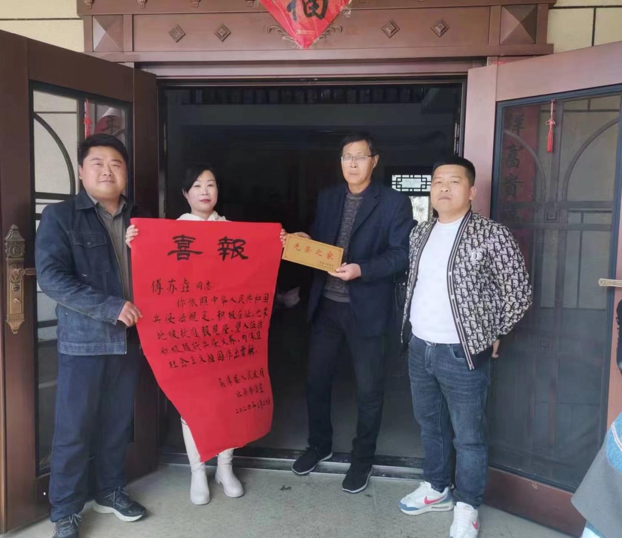 为进一步坚定入伍新兵保家卫国志向,弘扬拥军优属、拥政爱民的光荣传统,近日,高淳区固城街道前陇村党总支书记陈飞带领村“两委”班子敲锣打鼓地将入伍通知书和喜报送到了松园自然村新兵傅苏垚的家中。傅苏垚的家人激动地接过喜报,脸上洋溢着自豪和幸福的笑容。