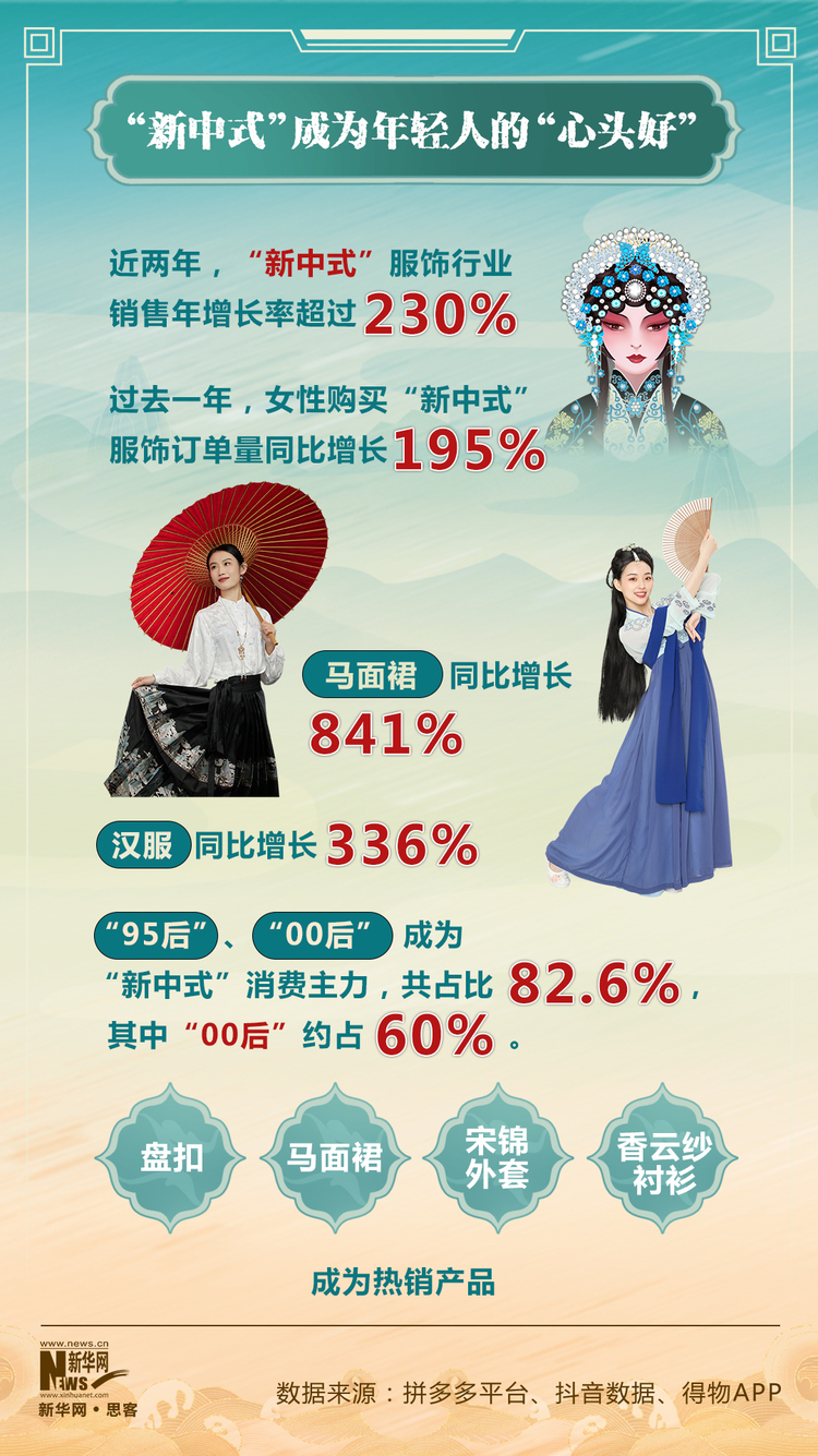 据拼多多数据显示,近两年,“新中式”服饰行业销售年增长率超过230%,盘扣、马面裙、宋锦外套、香云纱衬衫成为热销产品。
