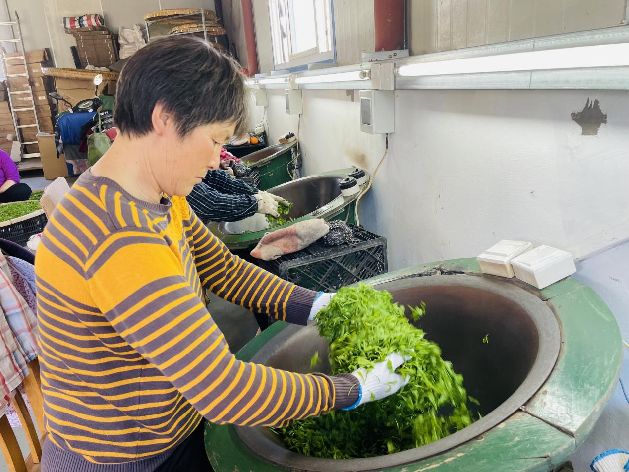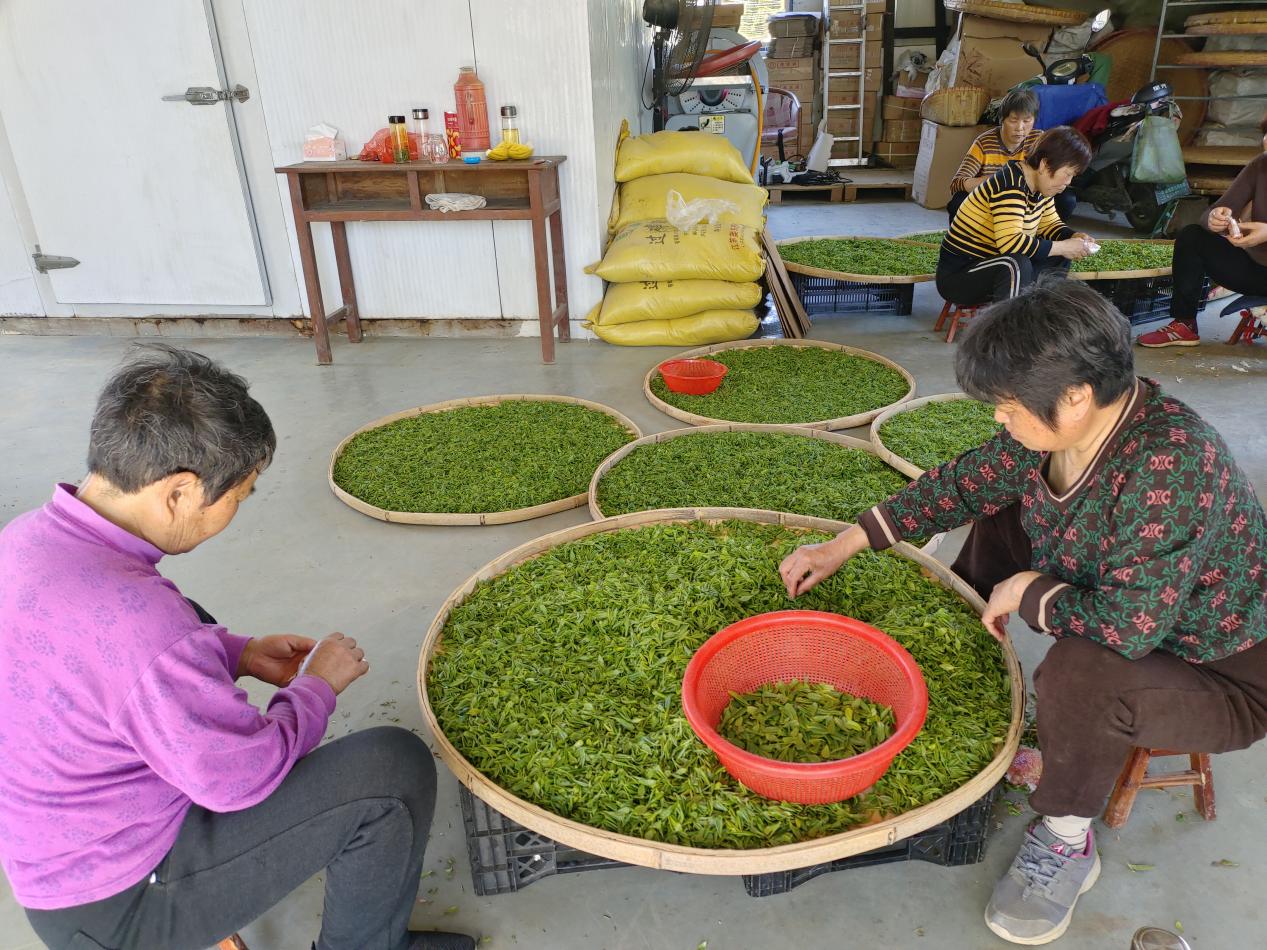 在公司制茶现场,制茶工各司其职,或在扁筐里分拣嫩叶,或在铁锅里用传统纯手工炒制新茶,或对茶叶烘干杀青,现场茶香四溢。