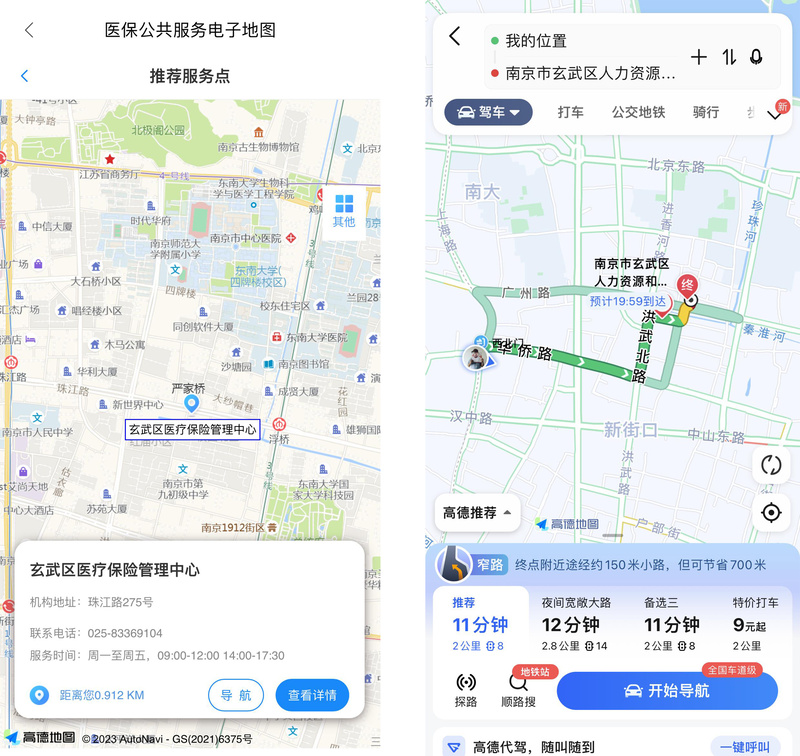 地址指引功能。借助手机App定位,自主选择搜索或定位周边就近服务网点,根据自身需求对接高德地图、百度地图、腾讯地图等多种导航软件,即时跳转到所选医保公共服务点地图程序界面,提供包括公共交通、驾车、骑行和步行等多种出行方式的可达路径,以及到达所需要的时间,实时提供精准便捷导航服务。