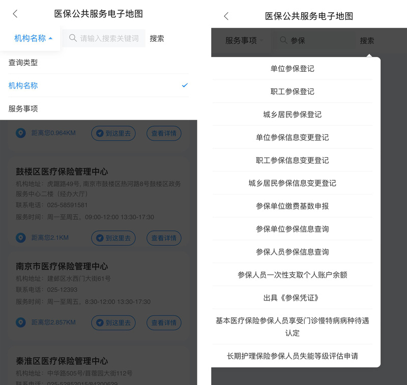 检索查询功能。参保人员根据不同业务办理需求,以地区进行区分检索,并提供“以事找点”和“以点找事”两种查询方向进行选择。通过两种查询方式提供的功能模块,结合自身定位选择意向医保公共服务网点,查询该网点所有服务事项,确定与自身办理业务需求的匹配度,借助导航自主选择前往。