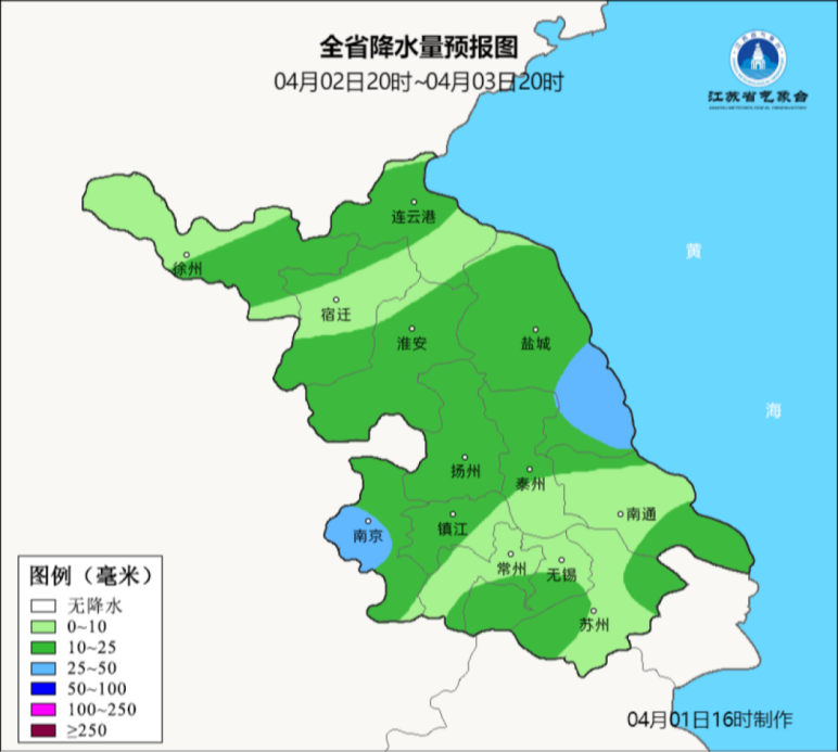 4月2日20时至4月3日20时,全省阴有阵雨或雷雨,雨量:沿淮及江淮之间地区中雨,局部大雨,其他地区小到中雨。最高温度:本省西北部和东南部地区21~22℃,沿淮东部地区14℃左右,其他地区16~17℃;最低温度:本省东部地区10~11℃,苏南地区15~16℃,其他地区13℃左右。全省偏东风4~5级阵风6级转偏北风5~6级阵风7级,有雷雨地区雷雨时短时阵风8~9级。