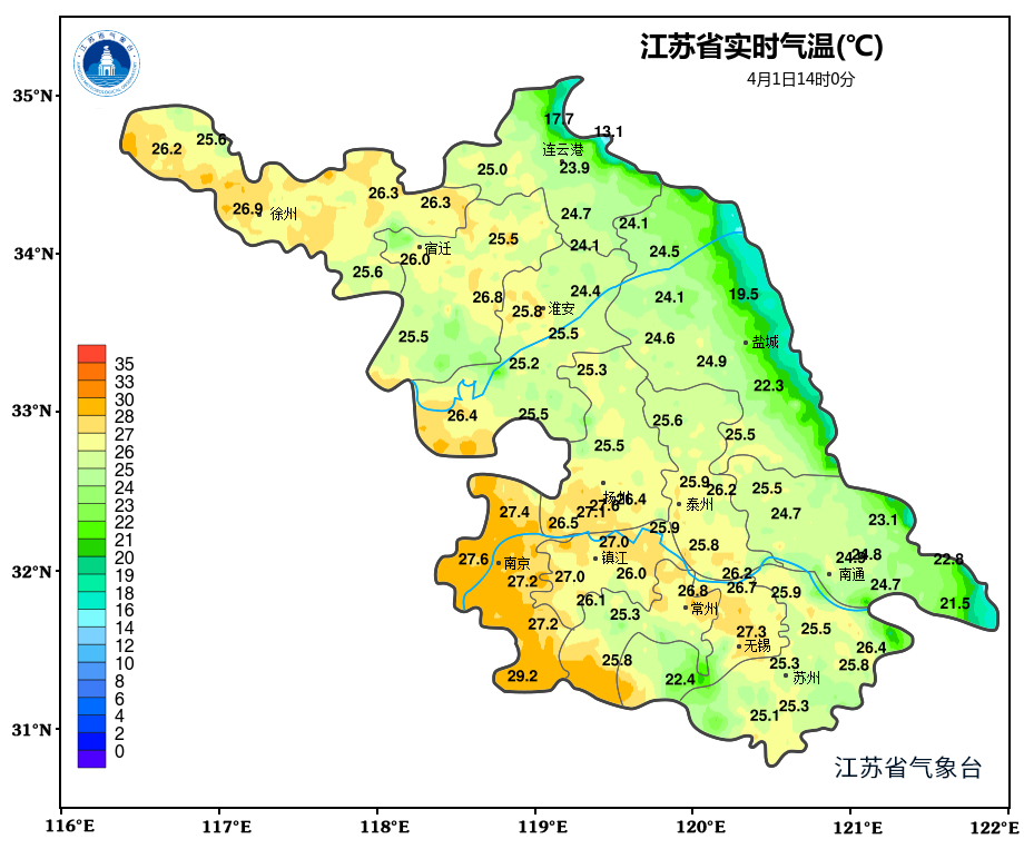 今天全省多云到晴。下午2时,全省气温比昨天同一时间升高了4~8℃,绝大部分地区气温都在20℃线上。13个城市中,只有靠东部沿海的连云港(23.9℃)、盐城(24.9℃)和南通(24.9℃)在25℃线下,其余10市都在25℃以上,其中南京(27.2℃)扬州(27.6℃)、镇江(27℃)和无锡(27.3℃)都超过了27℃,全省最高气温在高淳,达到了29.2℃。