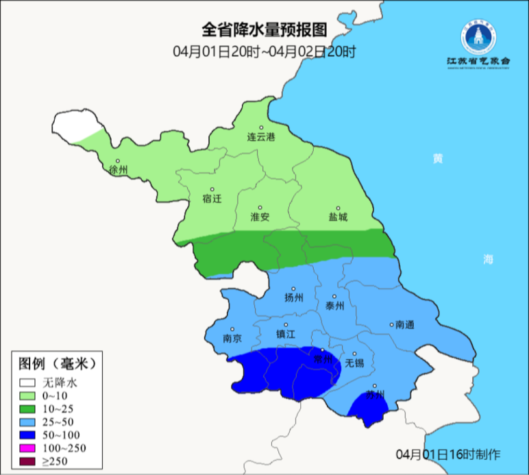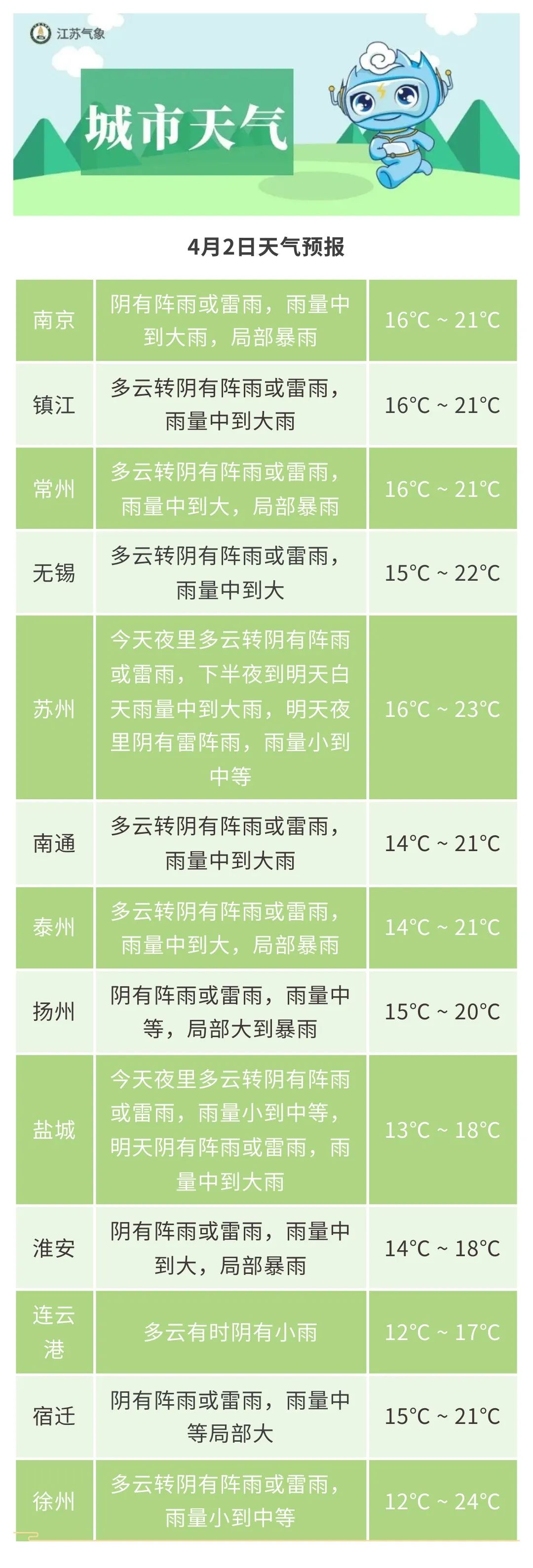 4月1日20时至4月2日20时,全省阴有阵雨或雷雨,其中沿江和苏南地区中到大雨,局部暴雨。最高温度:本省西北部和苏南地区24℃左右,沿江以北东部地区18℃左右,其他地区20~21℃;最低温度:本省东部地区12℃左右,西北部和西南部地区15~16℃,其他地区14℃左右。全省偏东风4~5级阵风6级,有雷雨地区雷雨时短时阵风7~9级。