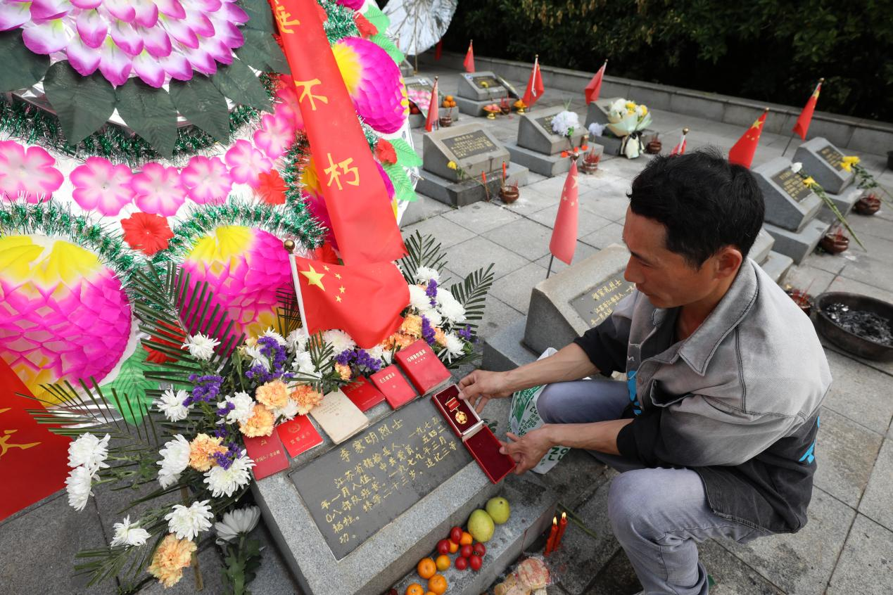 “哥哥,我带着侄儿来看你了,我们好想你啊。”“大爷我把您的军功章给您带来了,给您摆上,您看一看。”在李家明烈士墓碑前,妹妹李秀兰带着侄儿李大良一边诉说着对亲人的思念,一边整理着烈士的军功章和挽联。