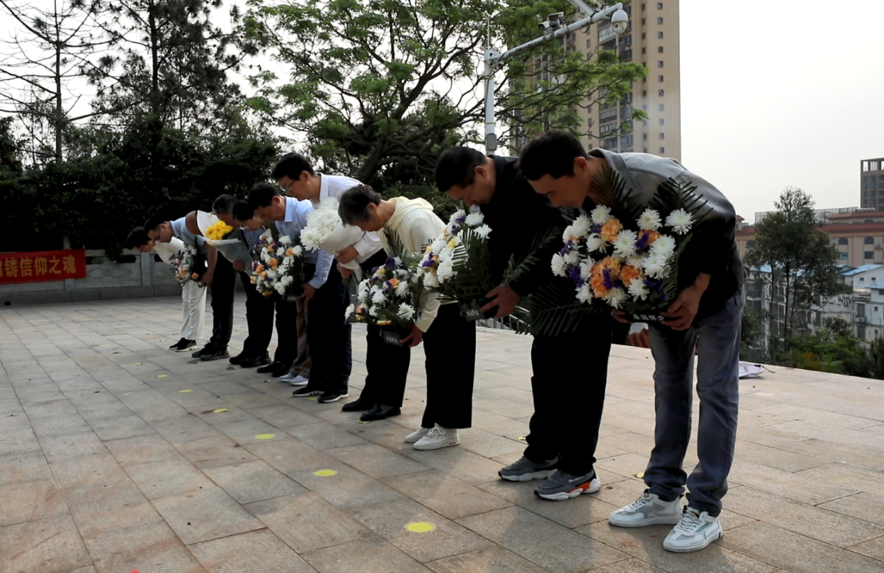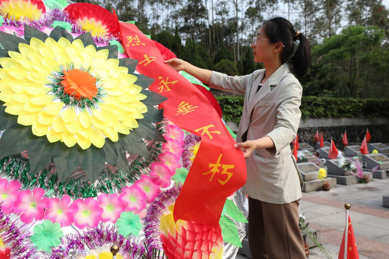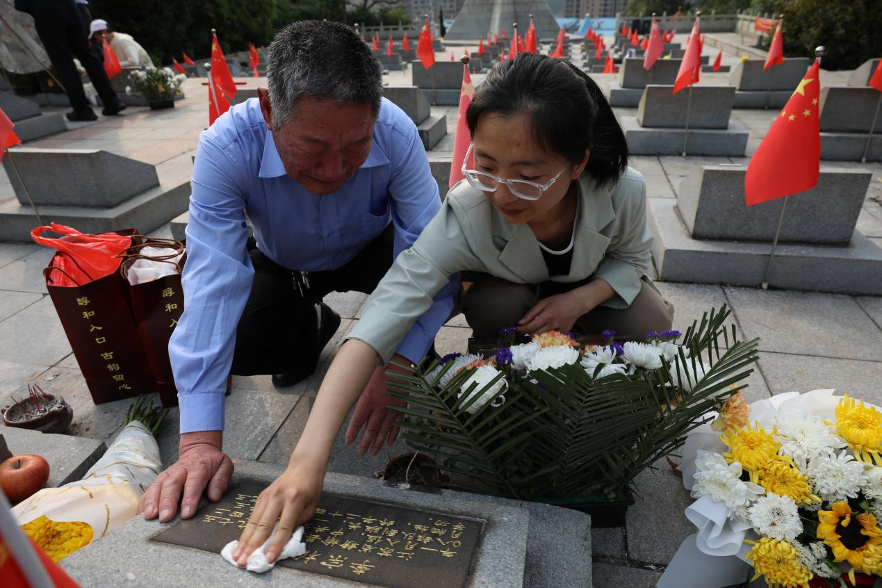 集体鞠躬、默哀,为烈士们献上鲜花……烈士亲属们陆续在烈士陵园内找到了亲人墓碑。