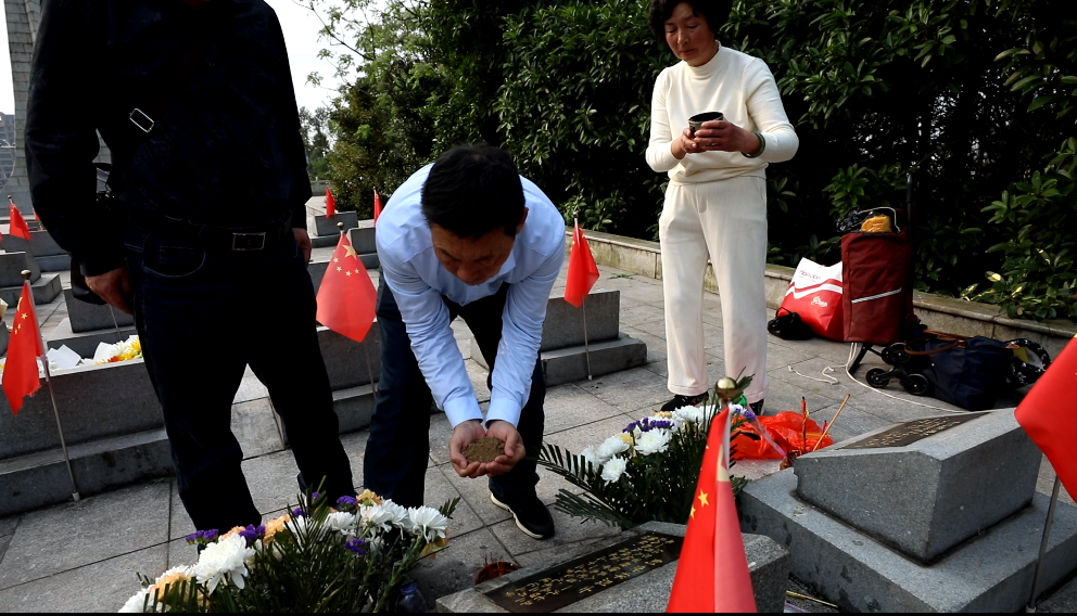 “我们带走一抔墓土,就是带哥哥回赣榆老家了,让他魂归故里,也方便亲人祭扫。哥哥牺牲时24岁,从爷爷到我们,一家三代多年来的心愿现在终于圆了。”刘世忠夫妇俩手捧着从家乡带来的故土,小心翼翼地撒在哥哥刘世祥烈士的墓碑上。