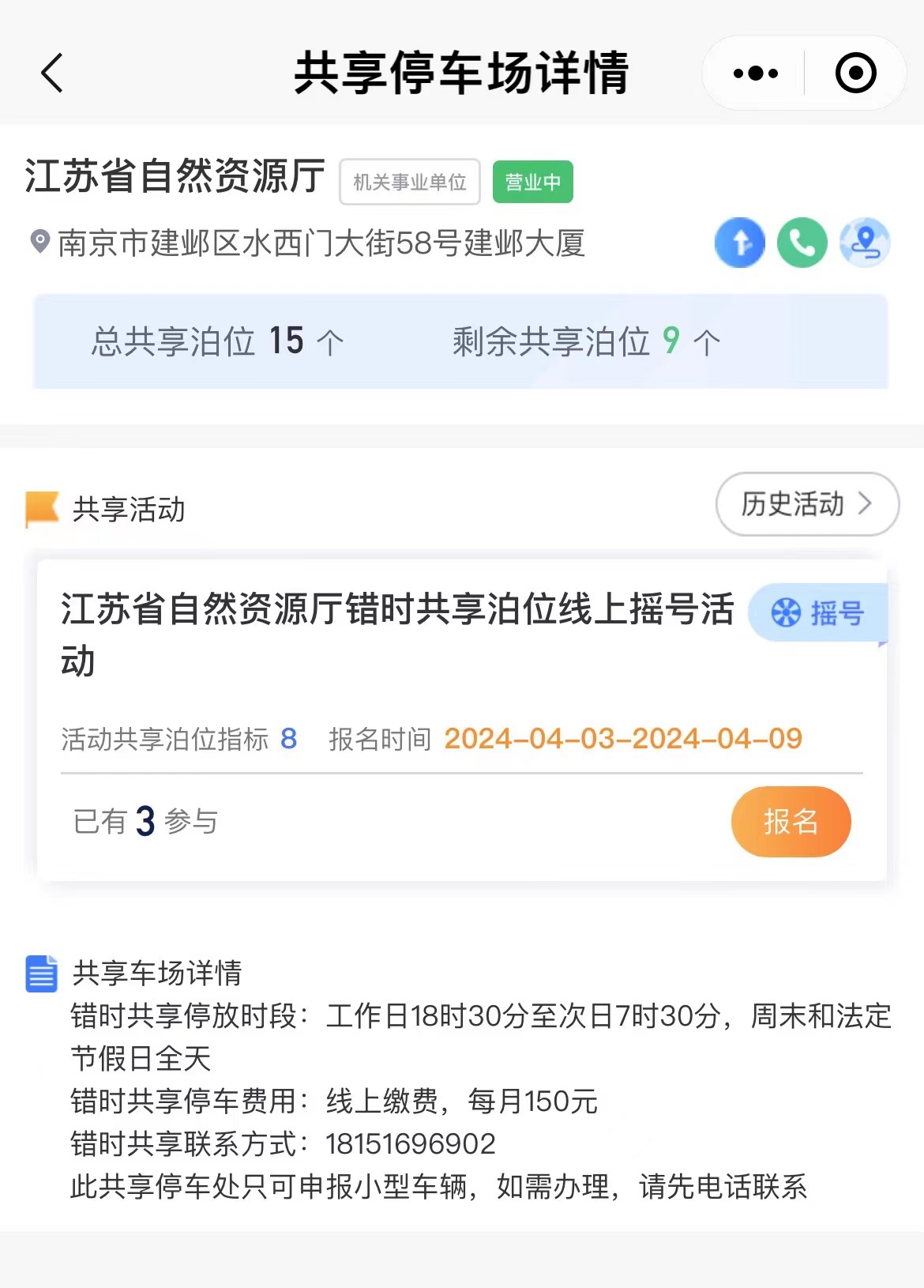 3日上午,记者在江苏省自然资源厅停车场看到,15个共享车位都有醒目标识。建邺区莫愁湖街道停车站站长王镇说,此处共享停车场还有8个车位未签约,此次一并开放报名。中签市民与江苏省自然资源厅签订停车服务协议,并在“宁停车”微信小程序首页点击“包月服务”,选择“共享月卡”-“可购买”进行包月缴费,即可完成办理。停车每月150元,共享车位开放时间为工作日晚上6:30到次日7:30,周末、法定节假日全天。