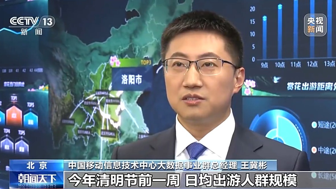 中国移动信息技术中心大数据事业群总经理 王冀彬:今年清明节前一周,日均出游人群规模相较于去年同期增长了25%,预计清明节当天出游规模会达到峰值,赏花人群较去年同期增长了18%。