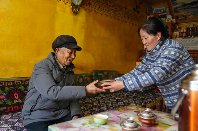 大儿媳央金给洛桑贡布(左)敬茶(3月27日摄)。他说,30多平方米的房子