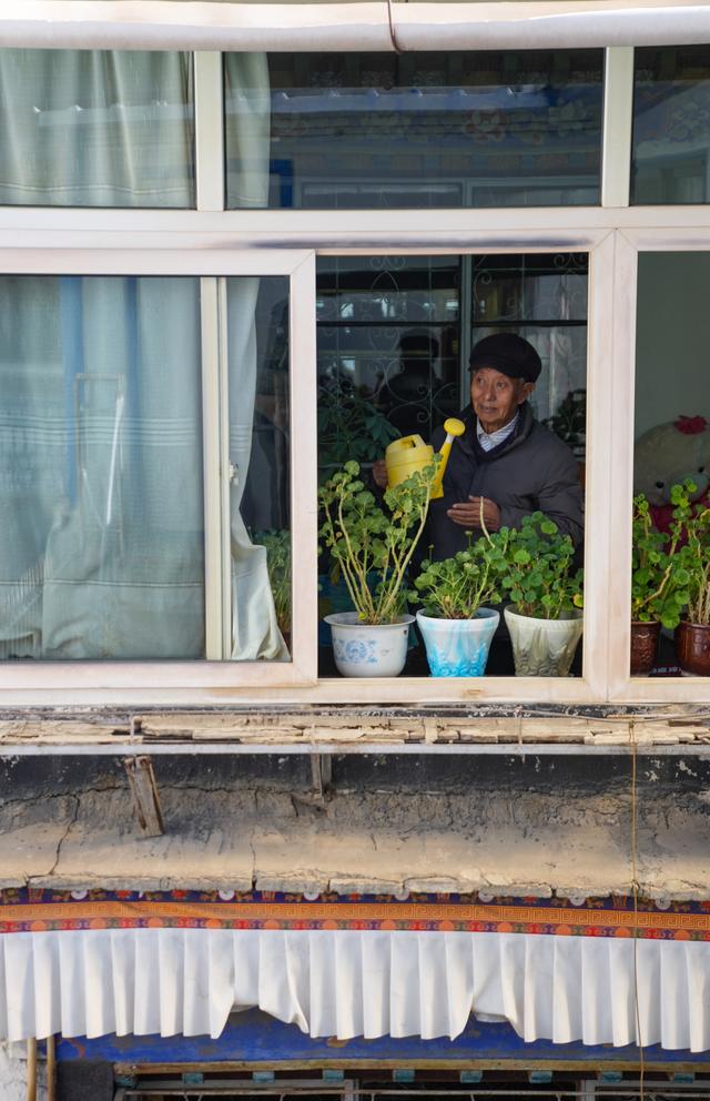 洛桑贡布在自家二楼阳台浇花(3月27日摄)。脏衣服洗了再穿,穿了再洗