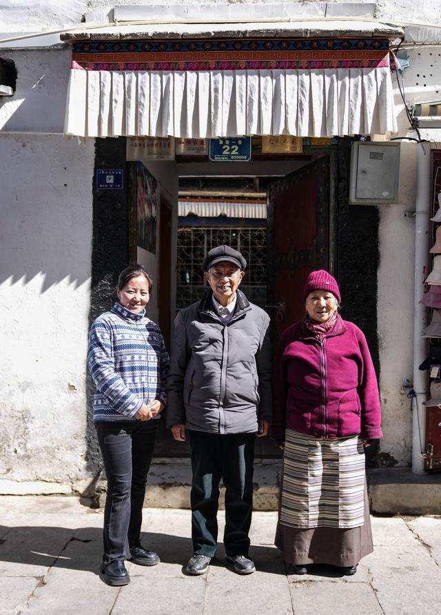 洛桑贡布(中)和大儿媳央金(左)、老伴次仁白姆在家门口前合影(3月27日摄)。只有经历了寒冬的人