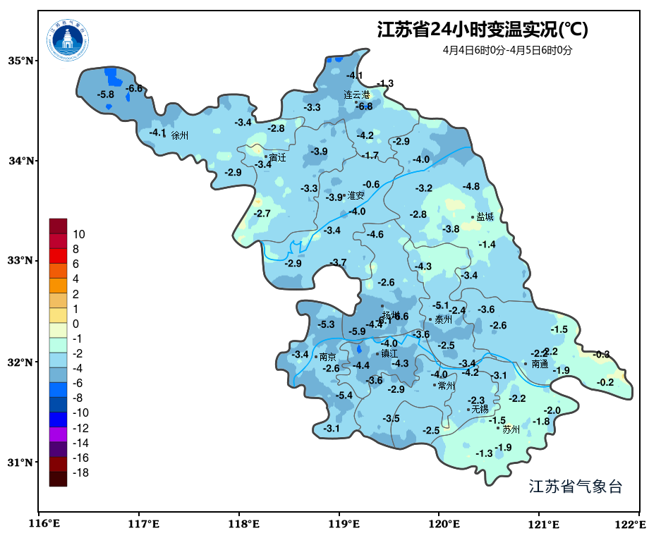 沿江和苏南西部地区阴有阵雨,其他地区多云。最高温度:淮北地区和本省东南部地区18℃左右,其他地区15~16℃;最低温度:本省东北部地区8℃左右,其他地区11~12℃。全省东北风3~4级。