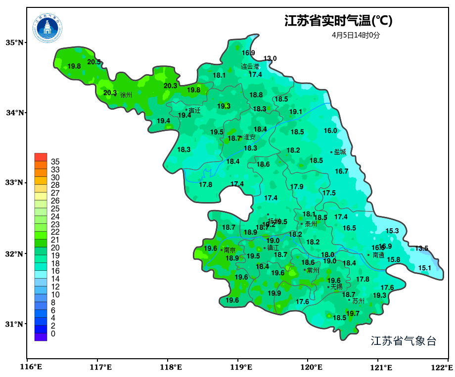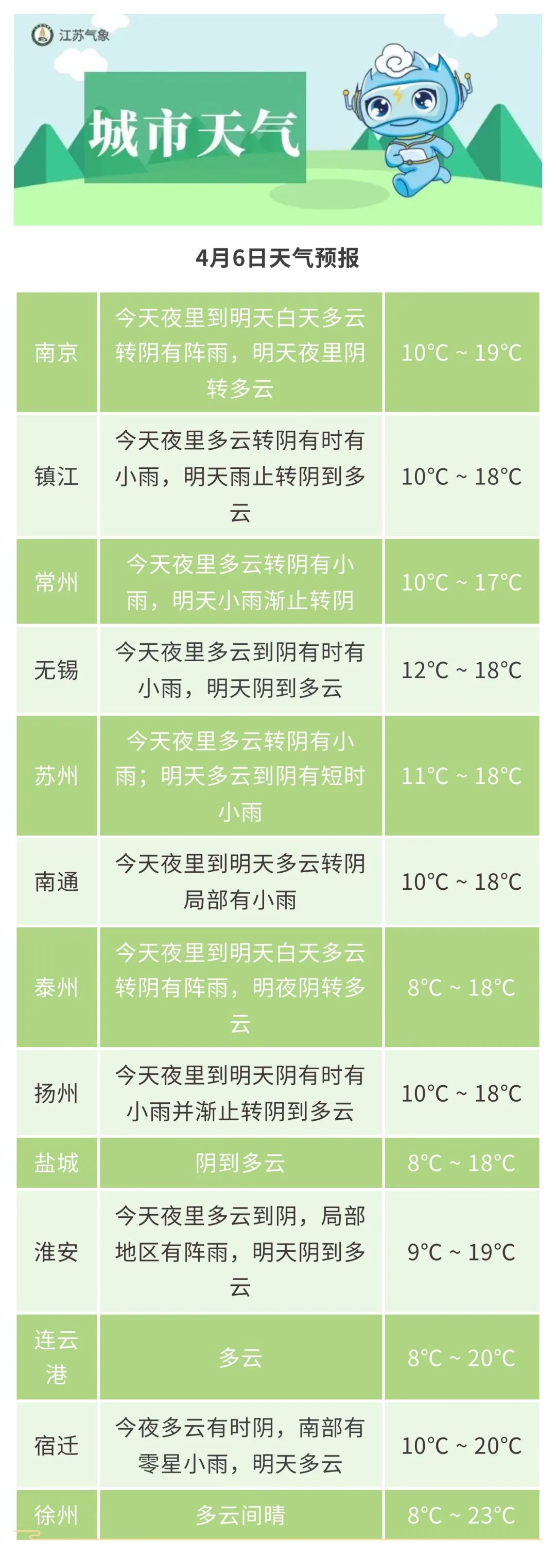 沿江和苏南地区阴有阵雨,局部雨量中等,其他地区多云。最高温度:沿淮和淮北地区21℃左右,其他地区18~19℃;最低温度:沿江和苏南地区10~11℃,沿江以北东部地区7~8℃,其他地区9℃左右。全省偏东风4级左右。