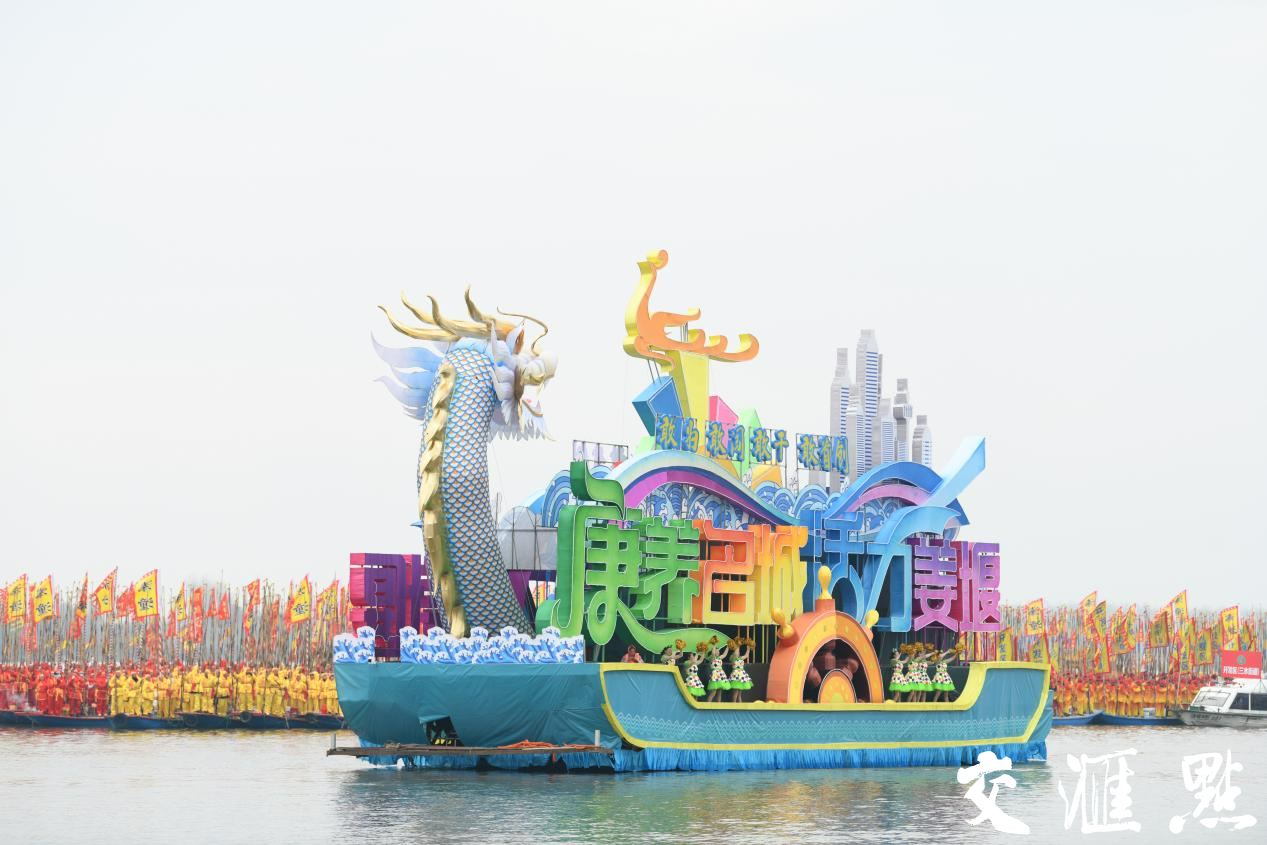 上午10时许,开篙仪式拉开了会船大幕,一时间万篙如林、激浪扬波,蔚为壮观。姜堰区精心打造的8条贡船,以“龙佑三水”“龙飞凤舞”“龙腾溱湖”“龙兴姜城”“鱼跃龙门”“龙行龘龘”“活力姜堰”为主题,造型丰富、制作精美。一船一景一境界,率先出场的贡船,吸引围观游客争相拍摄。贡船方阵之后,活灵活现的龙船紧随而来,行进的船上各色各样的“龙”翻滚腾飞于溱湖之上,象征着风调雨顺、五谷丰登。
