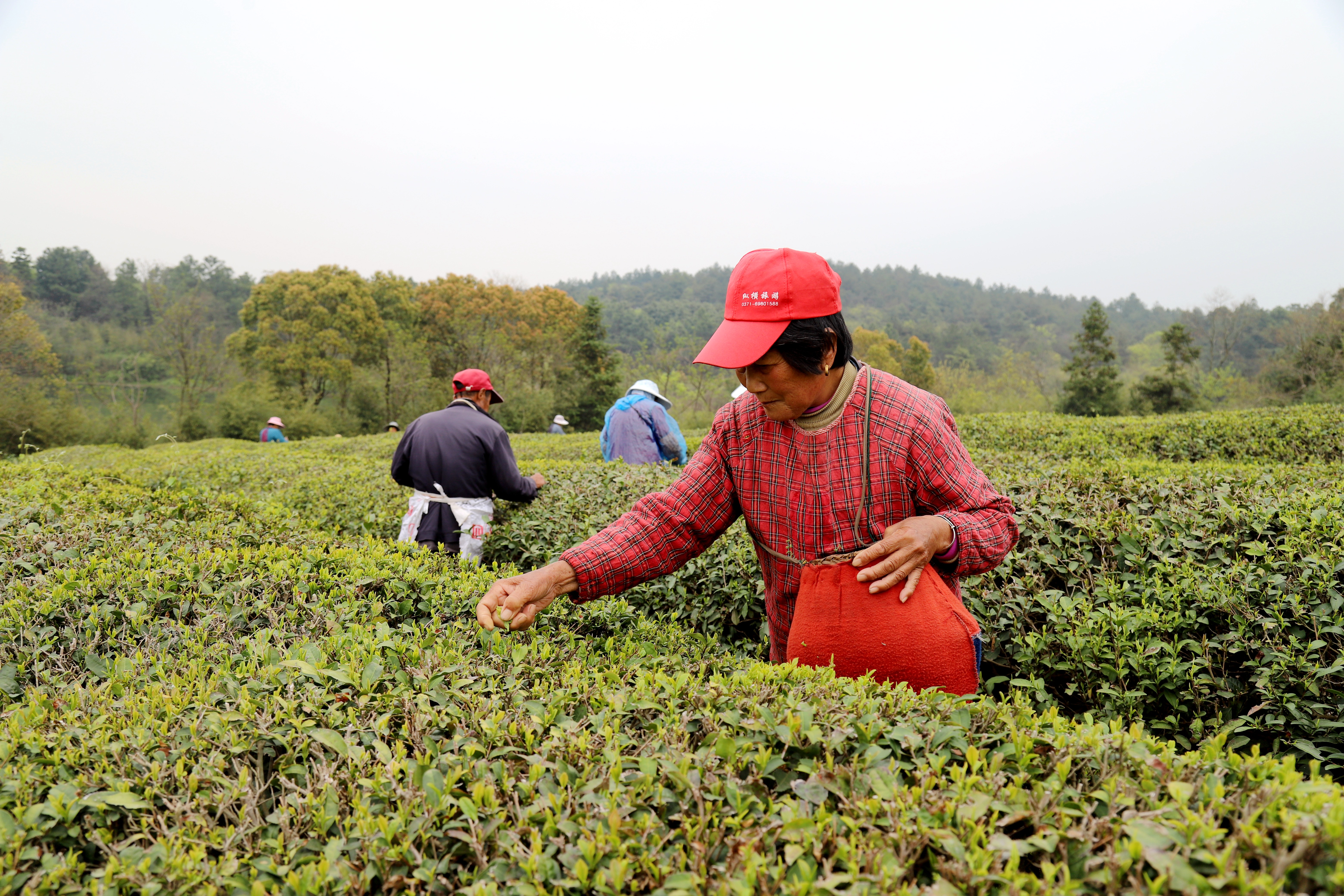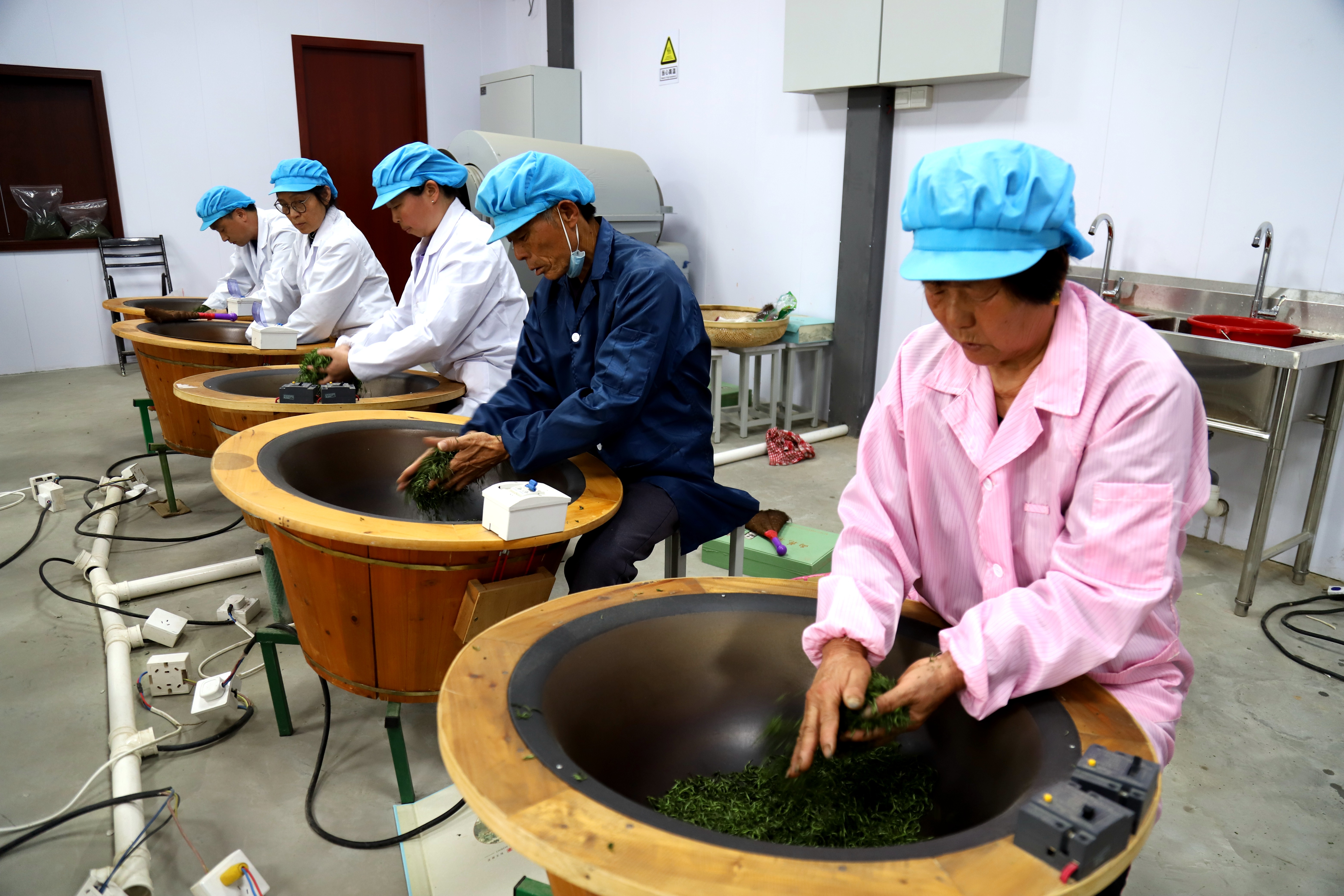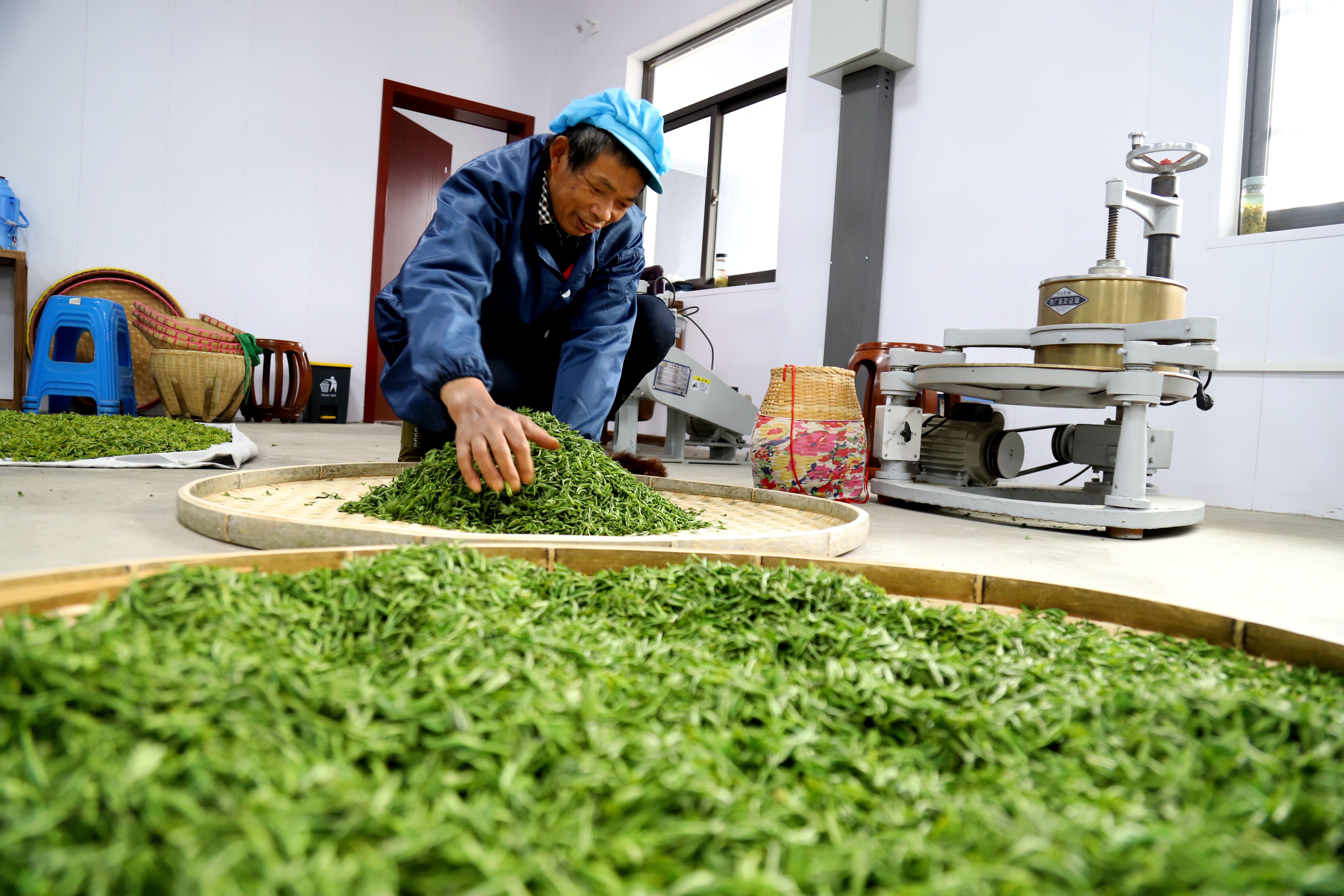 4月6日,江苏省南京市高淳区桠溪街道穆家庄村域见官塘茶果种植农民专业合作社生态茶园里,工人们有的在采摘春茶鲜叶,有的在手工制作碧螺春干茶,茶园处处春茶飘香。眼下正是春茶采收时节,穆家庄村利用绿色生态种植的近200亩茶树进入春茶采收期,为确保春茶丰产增收,该村每天组织工人加紧采收春茶鲜叶并生产加工碧螺春等干茶销往市场。