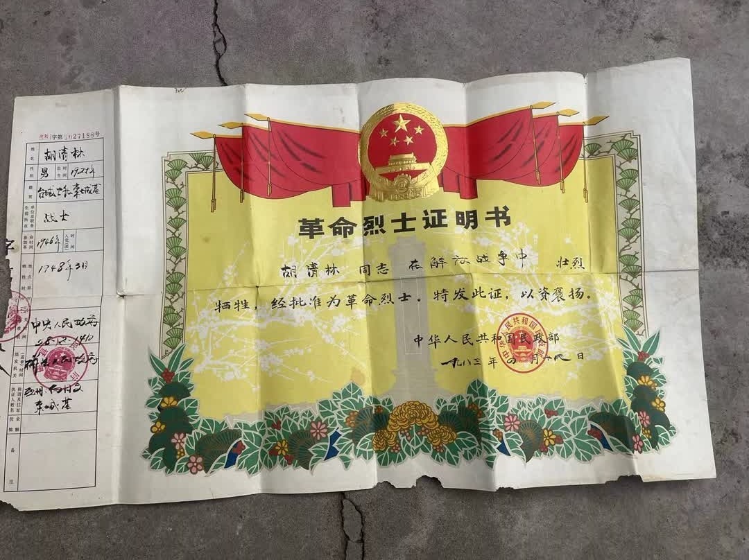 胡清林烈士3个侄子胡振江、胡振海、胡延海带来的革命烈士证明书记载着烈士的基础信息:1925年出生,1946年参加革命,生前任战士。革命烈士证明书编号为,冀烈字第0027188号。