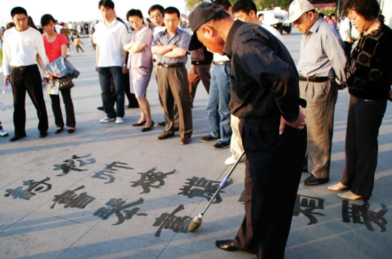 2006年5月27日,一位哈尔滨市民在松花江畔书写“地书”。