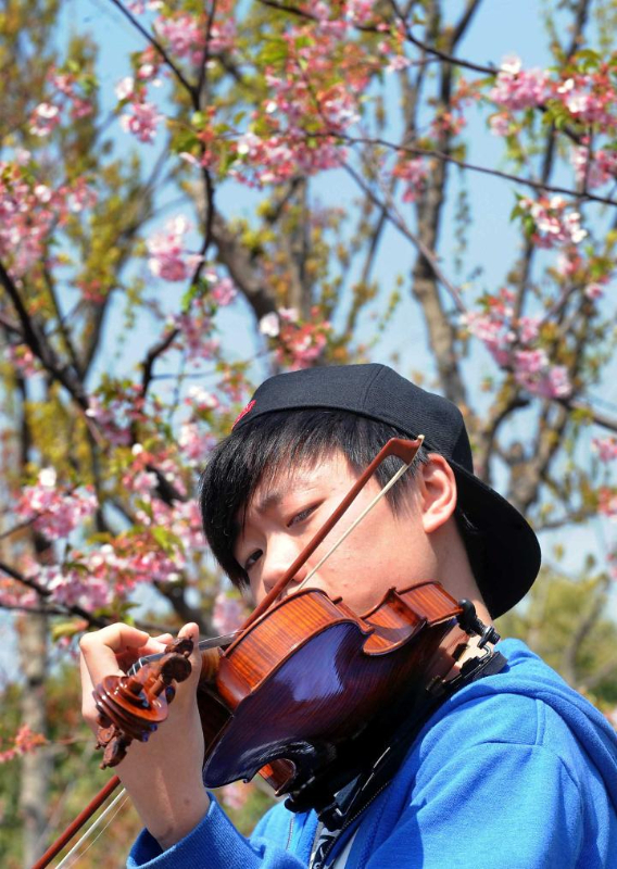 2011年3月30日,一位年轻人在上海市顾村公园樱花林中即兴演奏小提琴乐曲。