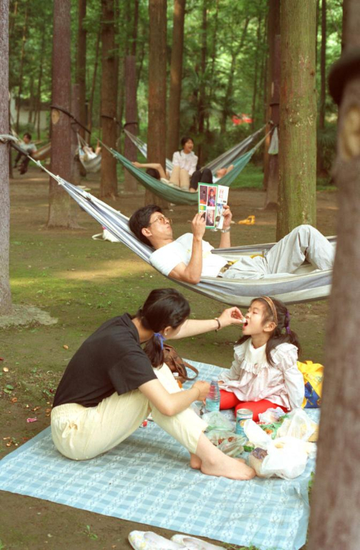 1991年,杭州西湖西岸的曲院风荷公园里,杉树参天,环境清幽,躺在吊床上消闲,不失为杭州人的一种雅趣。