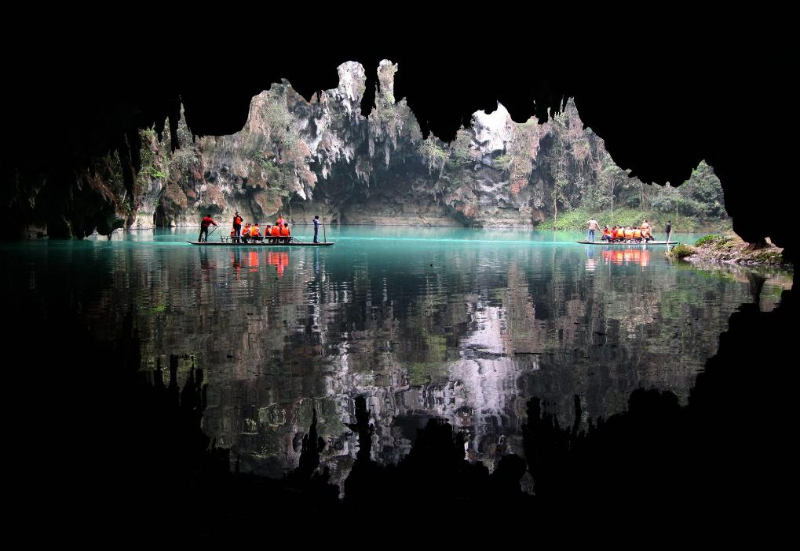 2011年4月3日,游客在广西凤山世界地质公园三门海景区游览。