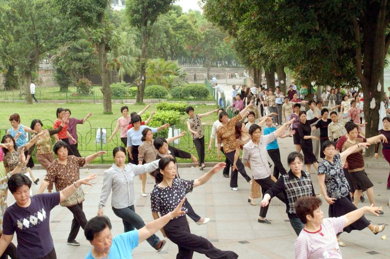 2003年5月6日,福州市民们在清晨的福州西湖湖畔做操健身。