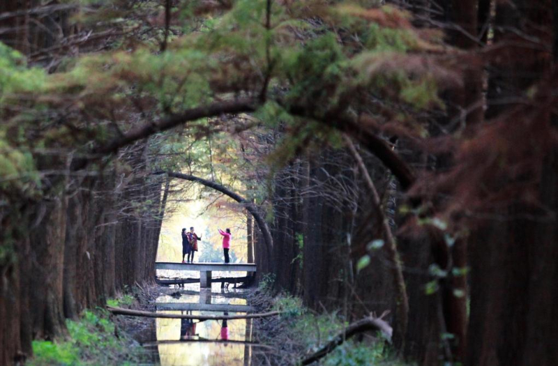 2020年11月16日,游客在江苏省高邮市清水潭湿地公园“水上森林”游览。