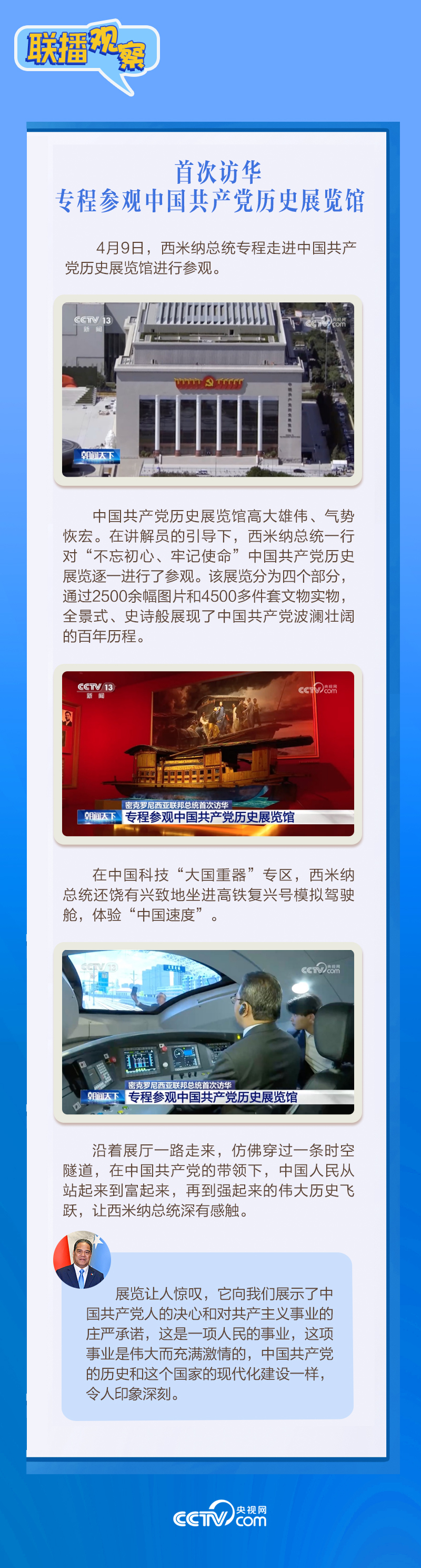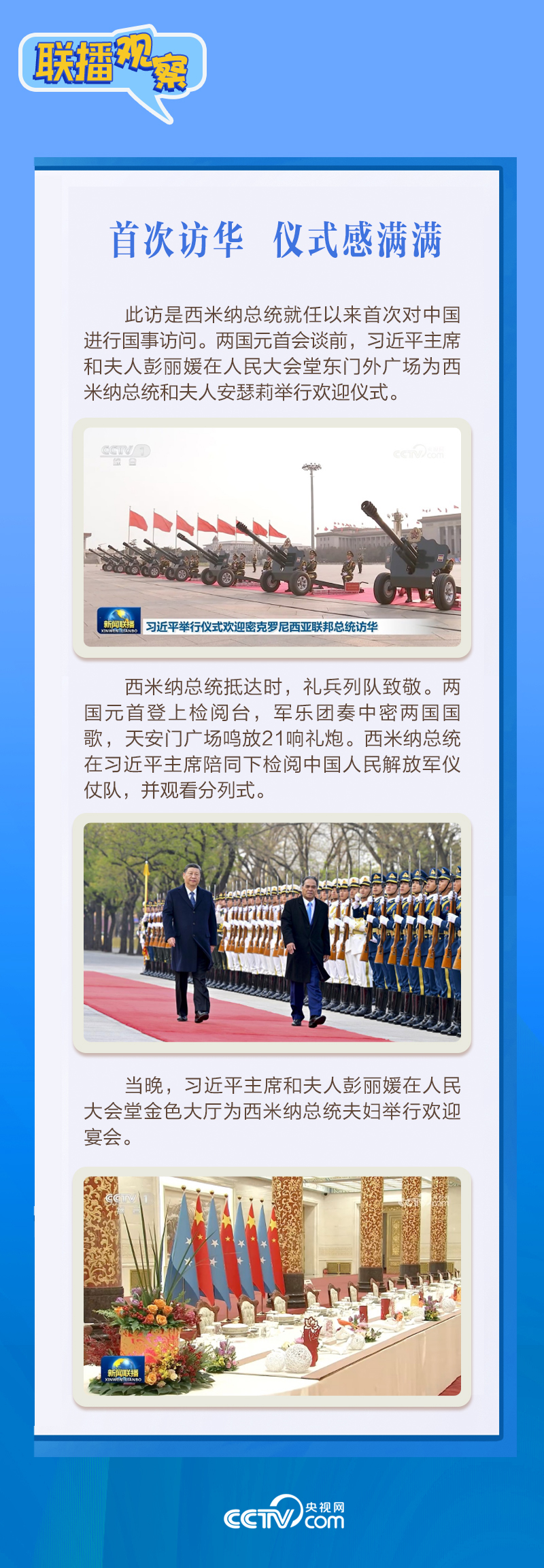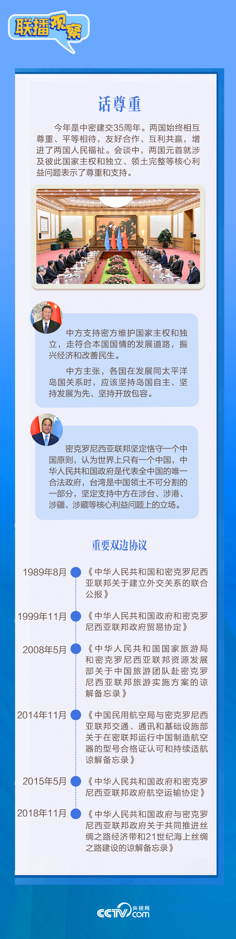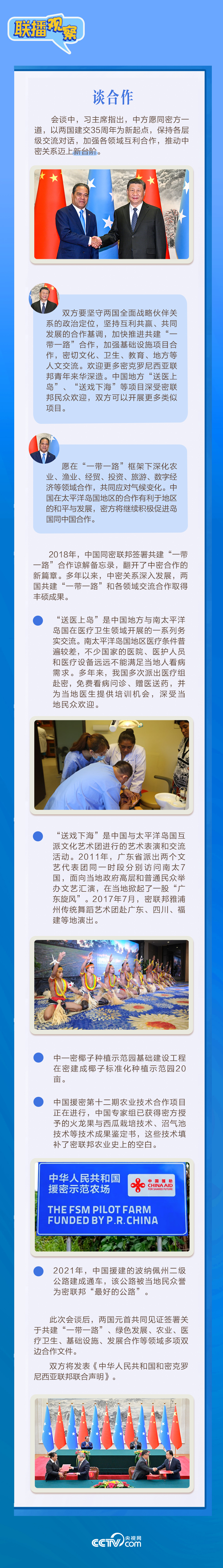 应习近平主席邀请,密克罗尼西亚联邦总统韦斯利·西米纳于4月5日至12日对中国进行国事访问。4月9日下午,习近平主席在北京人民大会堂同西米纳总统举行会谈,就双边关系发展及共同关心的问题深入交换意见。双方会谈哪些细节值得关注?央视网《联播观察》带您了解。